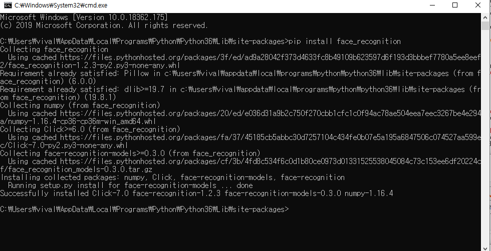 여기서 자동으로 numpy 모듈과 dlib 모듈이 설치가 됩니다.