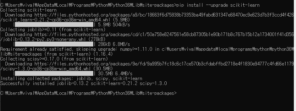 마찬가지로 cmd(명령 프롬프트)를 C:\Users\사용자명\AppData\Local\Programs\Python\Python36\Lib\site-packages에서 실행시켜 아래 명령어를 입력해 설치해줍니다.