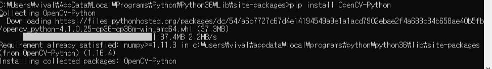 이제 C:\Users\사용자명\AppData\Local\Programs\Python\Python36\Lib\site-packages에서 cmd를 실행시켜 아래 명령어를 입력해 설치해줍니다.
