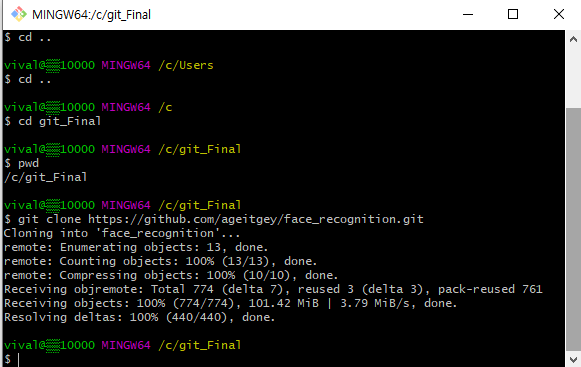 https://github.com/ageitgey/face_recognition에서 Clone or download 클릭-> URL 복사-> git Bash 실행 후 깃 설치할 폴더에 git clone URL 주소를 통해 프로젝트 파일을 내려받습니다.