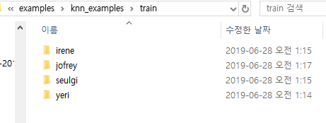 우선 이 예제를 실행하기 위해서는 깃 폴더\face_recognition\examples\knn_examples\train폴더에 라벨을 가진 폴더를 생성하고 해당 폴더에 식별하고자 하는 이미지 파일을 여러 장 넣어둡니다.
